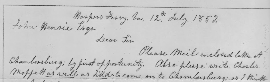 "Please write Charles Moffett as well as Tidd, to come on to Chambersburg, as I think we shall be ready for them as soon as they get on. . . ." John Brown